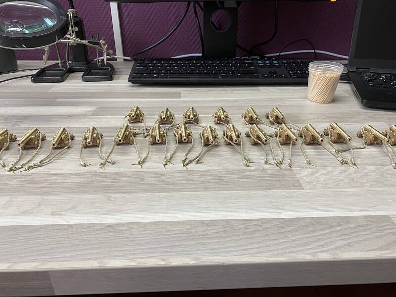 After the lathe process, the Guns were fitted with holes on the milling machine to taps into them. In the meantime I have taken everything to my workroom to put the Guns on the carriages. The 15 for the Upper deck are then first put on the deck to tune the height of the Guns. After that, the carriages are fitted with a breeching rope and I can finally start fitting out the Upper Deck again.