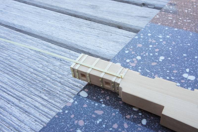 After this the head of the rudder had to be strengthened. I have chosen to use brass for this purpose and not to solder it. The strips are pulled around the head and secured with 3.5 mm nails. I chose brass of the right thickness, this means that you really have to let it run over each other so that there is no space between the strips and the wood. It is a laborious way of doing things and it just took me a day of work, but I am satisfied with the result.