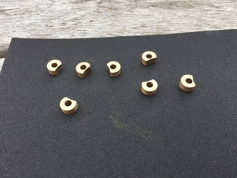 The parts of the hinge that come on the rudder I milled out of 3 mm brass. These 6 parts all have different lengths and are provided with a pin. For this purpose I have milled a groove on the head side, so that the pin can be soldered well into the fork. This way you don't see any soldering tin.