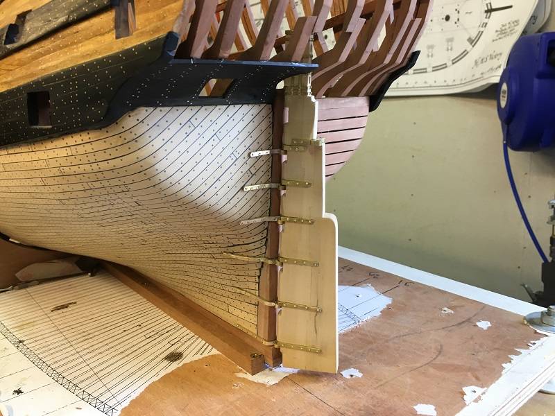 Het rudder is controlled by the steering wheel on the Quarter Deck, via ropes the control system on the Lower Deck is controlled. First, the rudder itself must be put together. the rudder is made of Ivorywood. The hinges are made of brass and everything has to work. As soon as all the brass is inside, we start building the rudder.