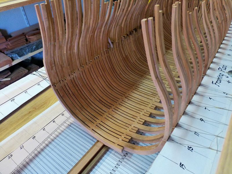 Yet to make two sections frames (8 frames) and then all frames which are placed on the keel ready. The frames 118 T / M 139 be placed on the side of the keel, so these are half-frames. On the upper right picture (below) shows that the keel is then still too low. These have yet to increase with several beams, there are at least 10 in a special form. Thereafter, there will be over the entire length still have to walk a beam from the upper side inside the stem to achterbal, this consists of nearly 20 parts.