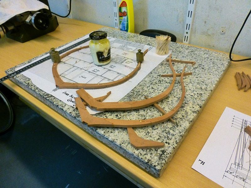 I started with the sawing the components of frame 110 t / m 113 and saw the parts in order to increase the keel at the rear. The work was tasty ...... at this time are the frames 110 and 113 glued and frame 111 is drying. I look at him a moment later if everything is correct, then I can glues tomorrow the parts of frame 112 against it .
