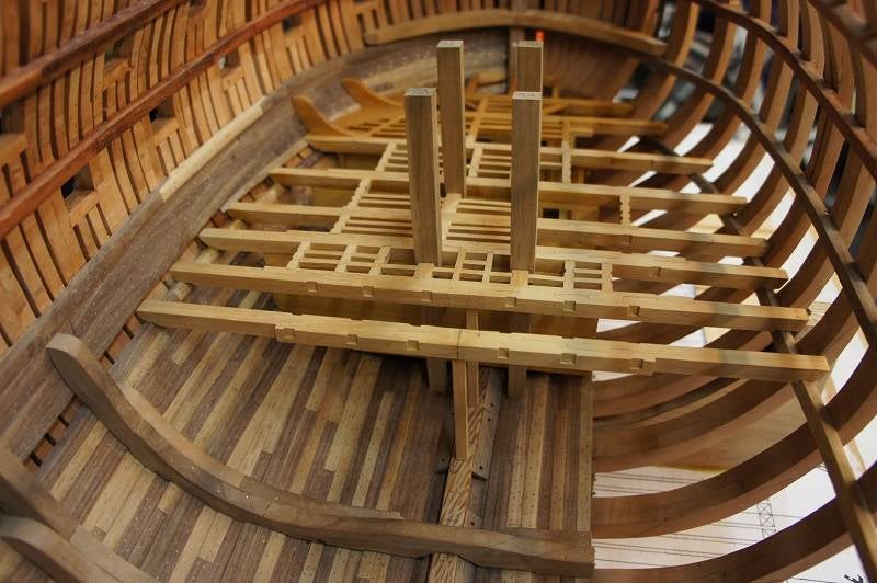 An Riding Bitt is placed on the Lower Deck at section M and Q. The frames of these anchor bitts run straight down through the Orlop Deck and stand on the floor of the hold. At section Q, where I am now, they also walk through the floor of the Main Room.