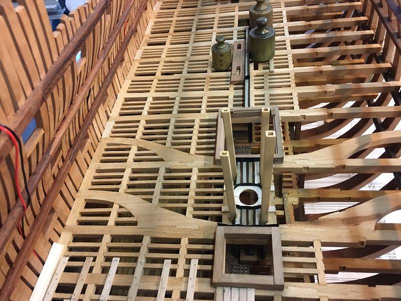 Meanwhile, the construction for the gratings, so the ropes from the anchor to the Orlop Deck run ready and placed. This construction is equipped with 2 sliding pieces where the anchor ropes slide over. First I'm going to build the 4 Chainpumps and the 2 Elm Tree pumps. Then I can place them and planking the middle piece.