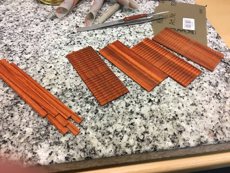 After planking the deck, the hull had to be planked on the inside. We finally decided to planking the inside of the hull with a neutral light color. This way the deck becomes a bit lighter and the parts that still have to be applied, stand out better.