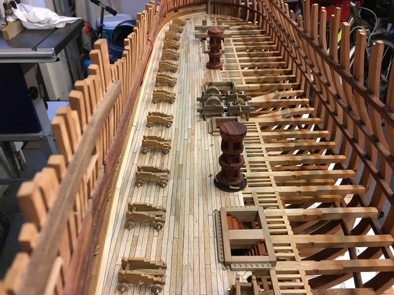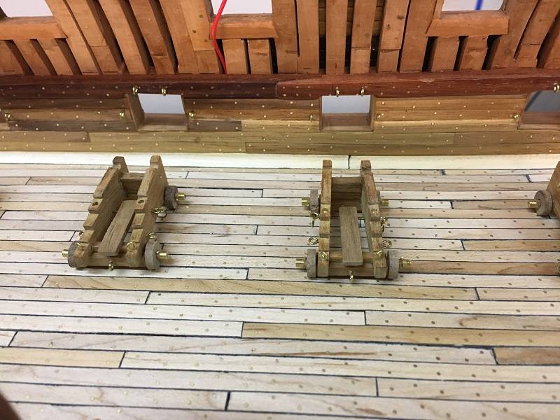 In between all the projects there was also some time to apply some parts to the Lower Deck. For example, all the beams on which the bullets are placed and also the eyes where the 'Training Tackles of the gun carriages are placed on the deck.