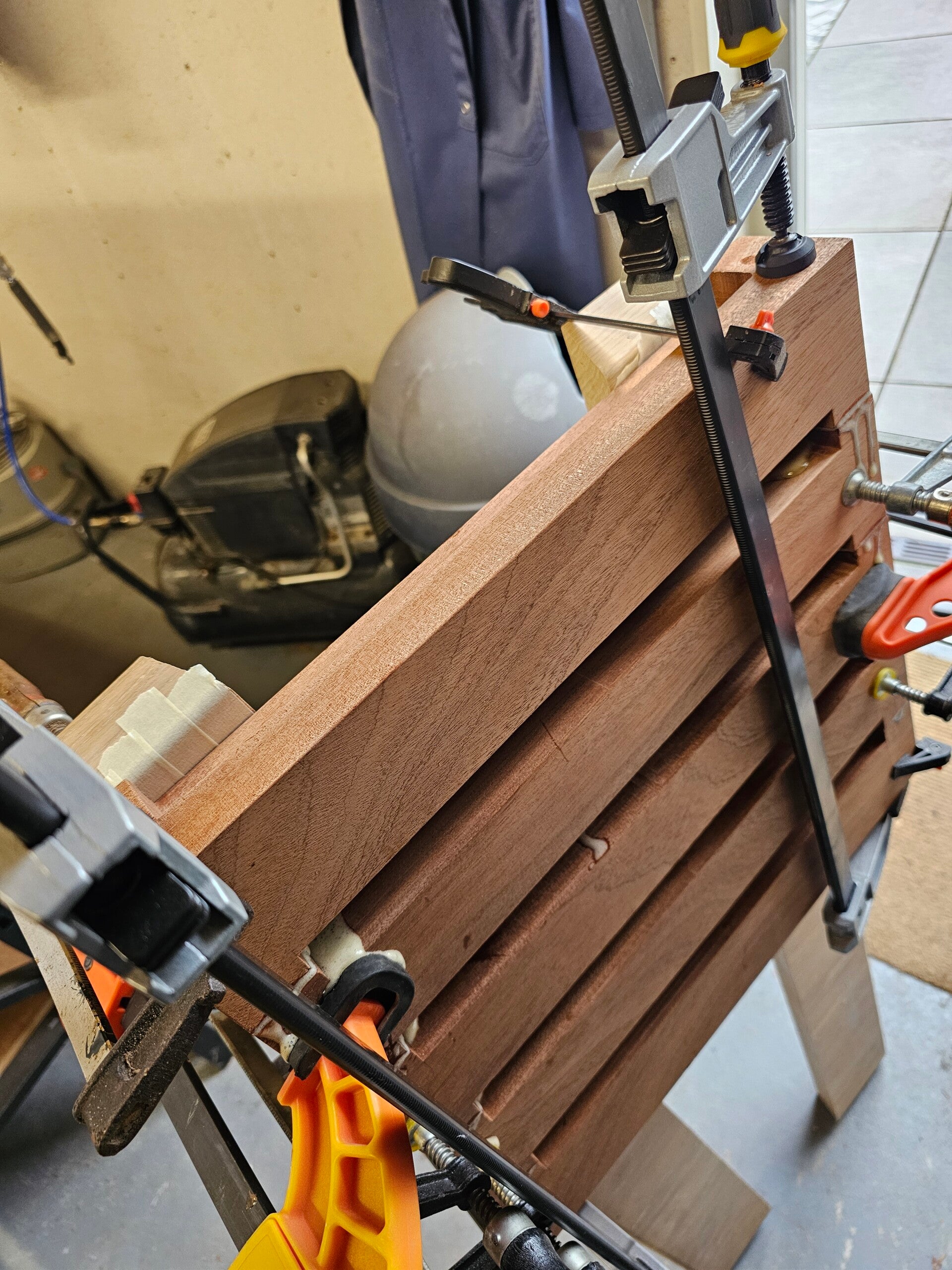 The latter is an extra project for her kitchen store. She was looking for a good holder to display kitchen fronts, etc., so that her customers could get a good overview. Because there is nothing available on the market, we decided to make it ourselves. We purchased mahogany wood for this purpose and have now started the initial work. I will keep you informed of developments on a regular basis.