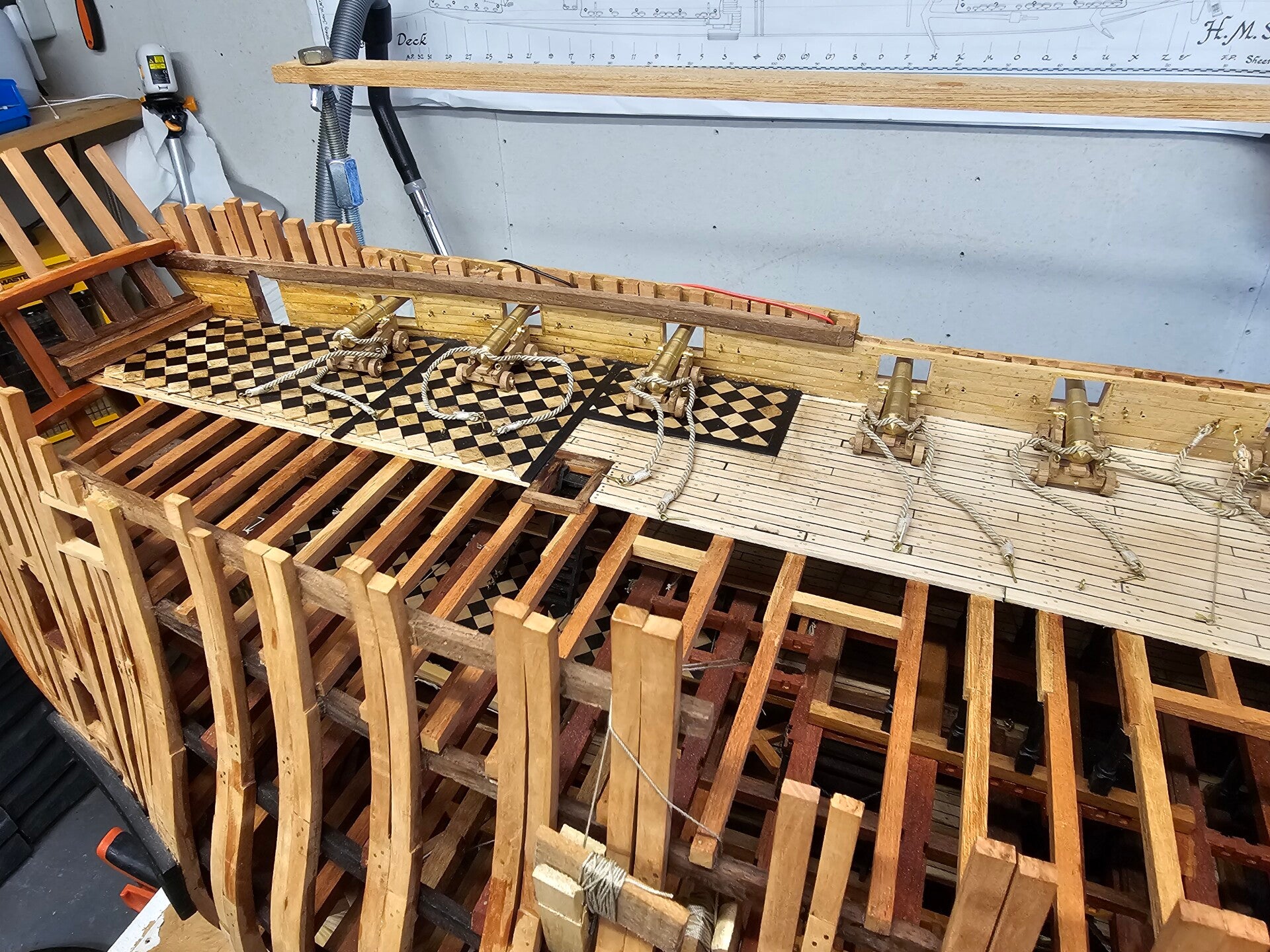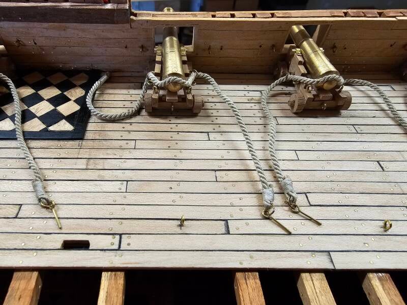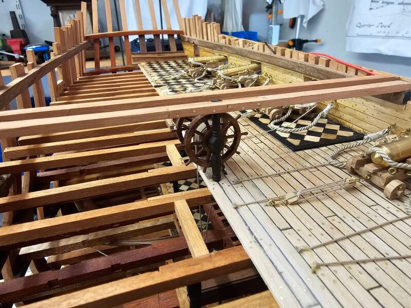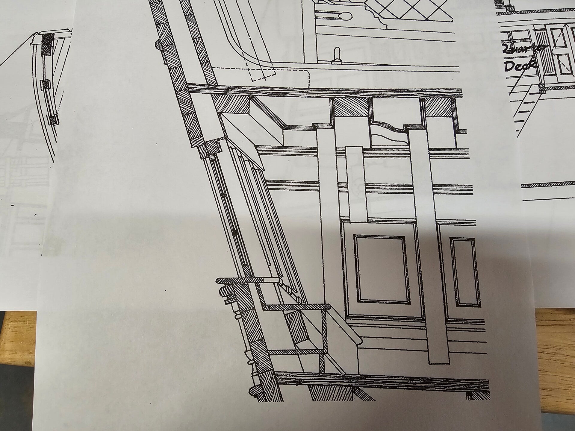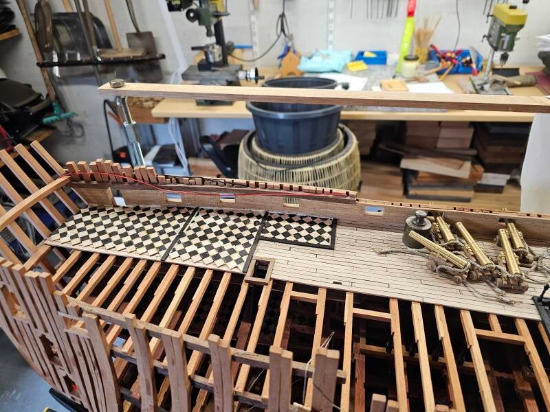 The drawings show that 3 of the 6 gunholes still need to be fitted with a hatch. These are applied as soon as the support beams for the Poopdeck are installed. Then the shutters are immediately provided with the operation for these shutters.