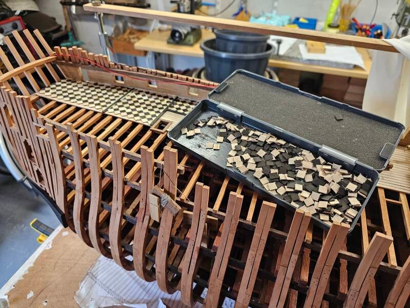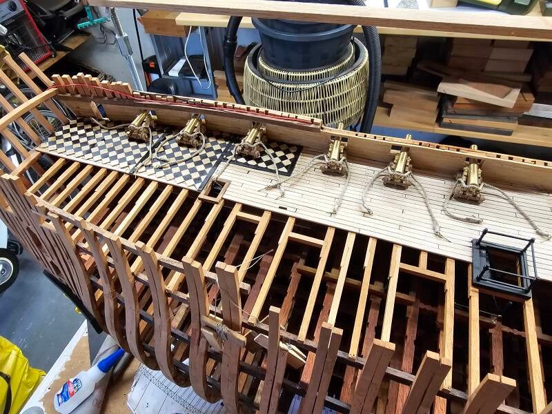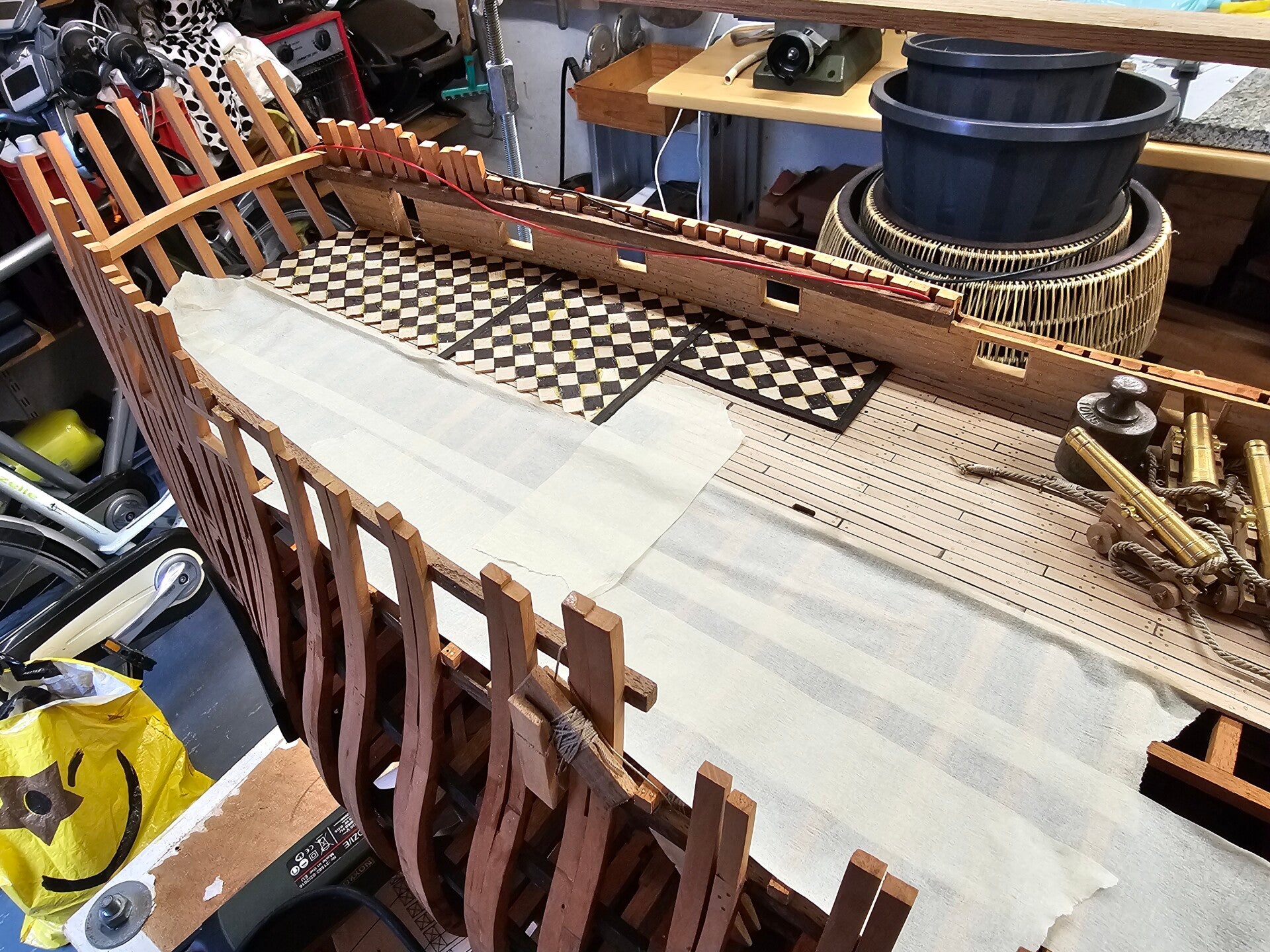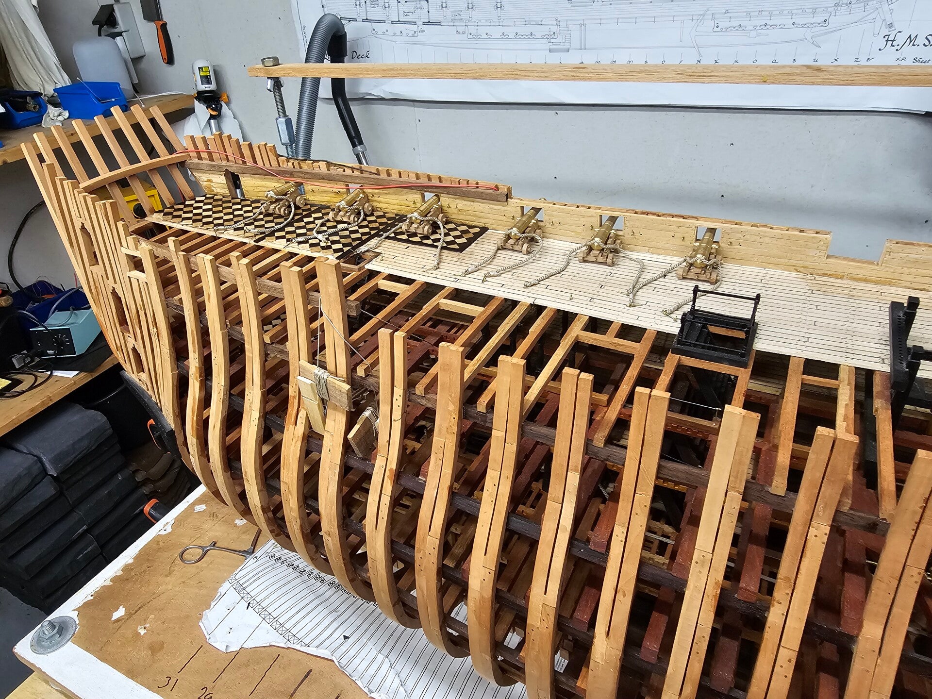 The drawings show that 3 of the 6 gunholes still need to be fitted with a hatch. These are applied as soon as the support beams for the Poopdeck are installed. Then the shutters are immediately provided with the operation for these shutters.