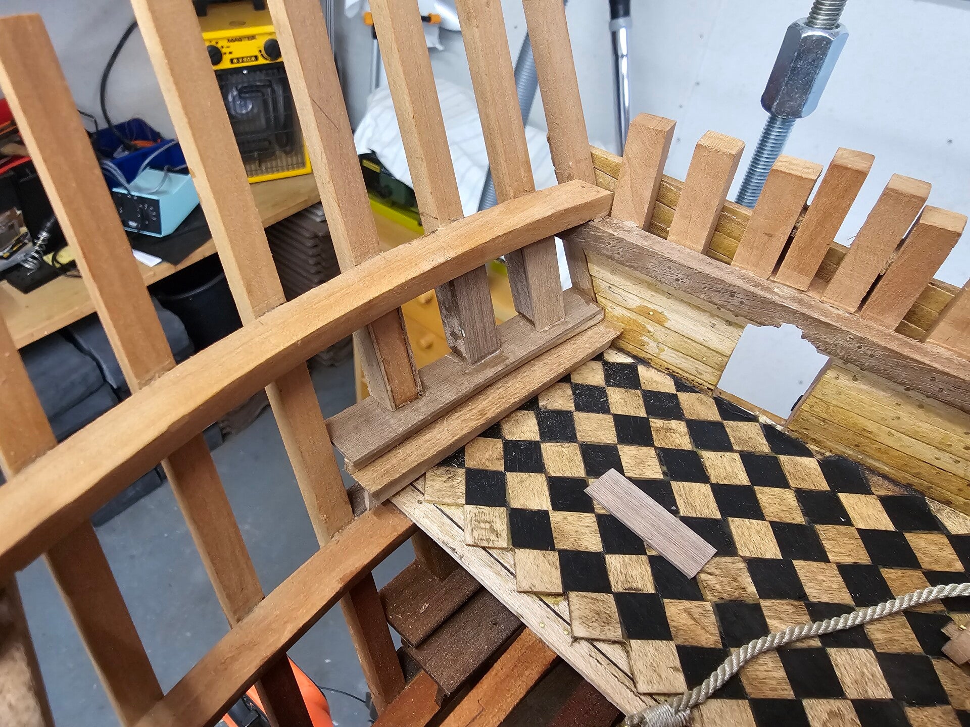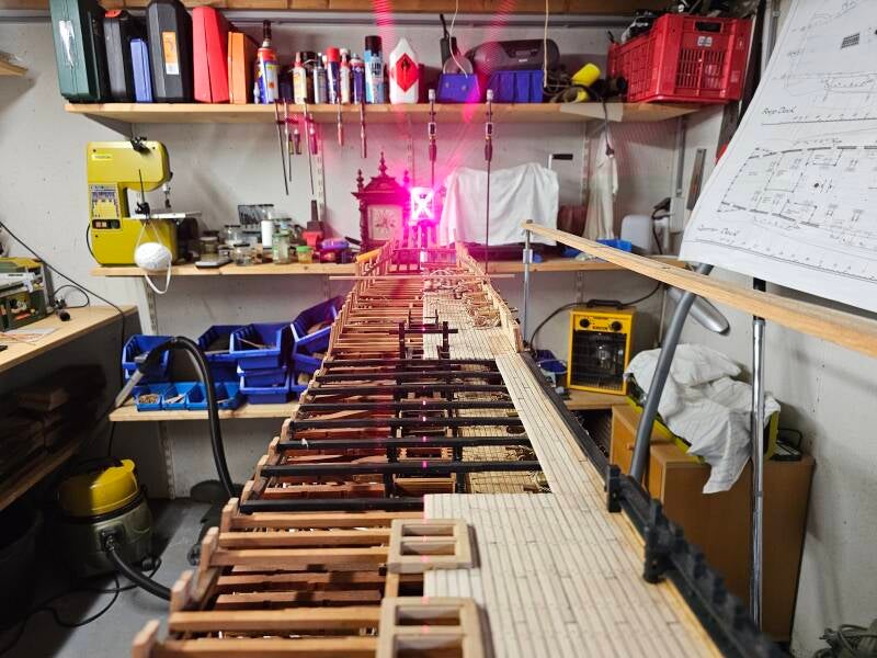 After the manufacture, I adjusted it well with the laser and then fixed it. The beginning of the Poopdeck is therefore made and the steering wheel can soon be placed directly and fastened under this bar.