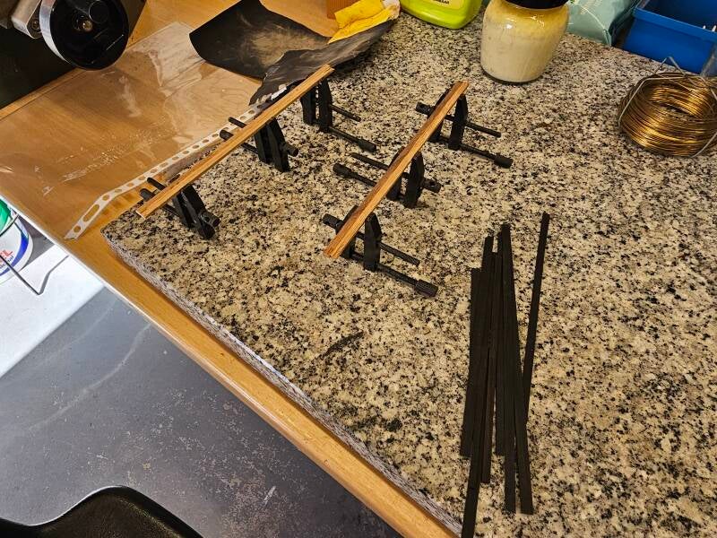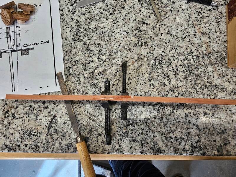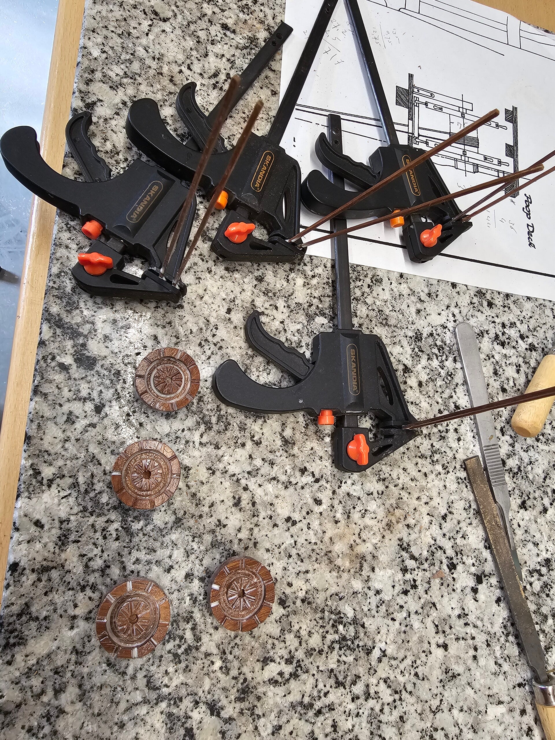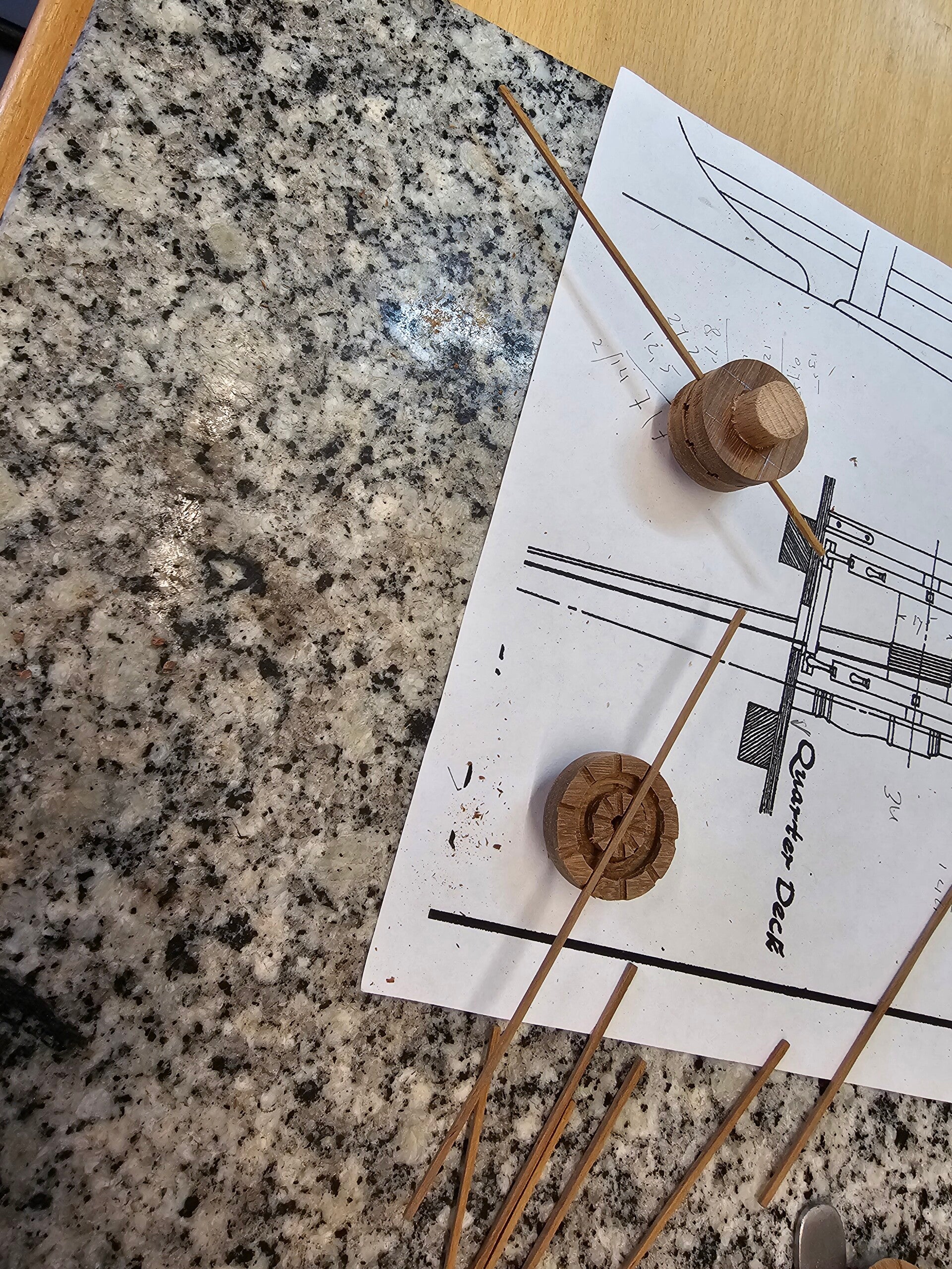 The dimensions are 1.45 x 1.45 mm and will soon be custom made on the lathe. Before I have milled the steering wheels to size, I have immersed both these and the slats in diluted wood glue.