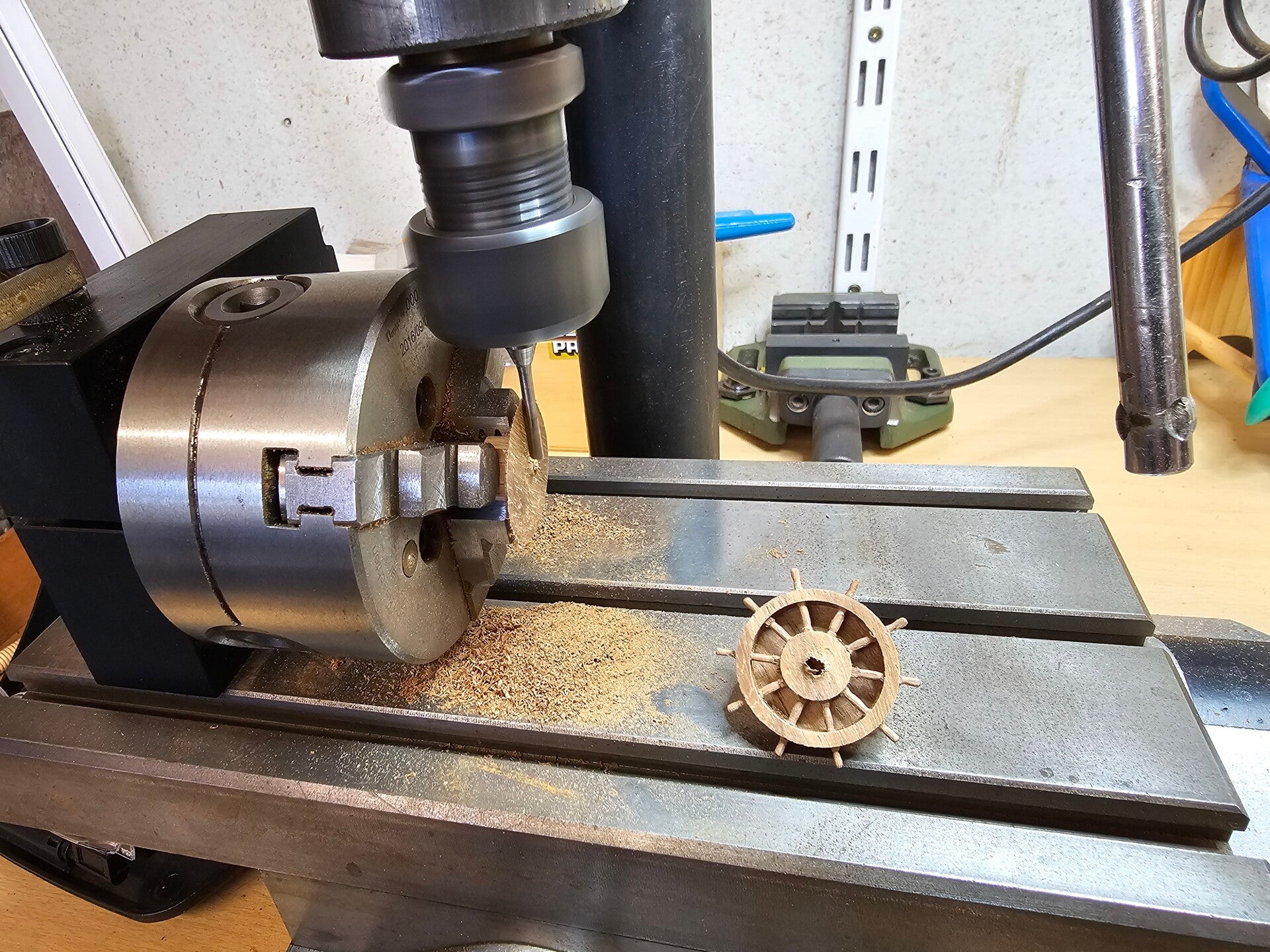 In between work on the floor, I mill the steering wheel parts. First, it's the steering wheel parts and I started with the slots for the spokes. The complete steering system is equipped with 2 steering wheels with 10 spokes each. These spokes are therefore clamped between 2 discs and I try to put them together in that way. The photos support the work.