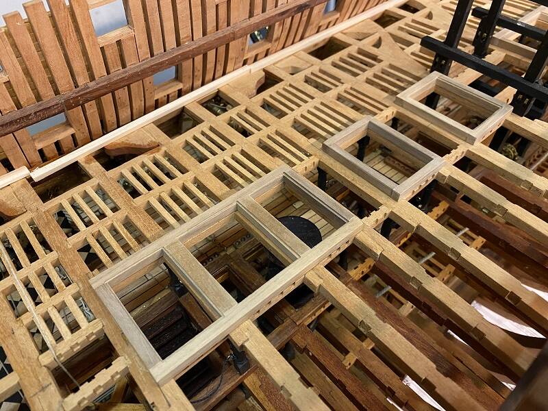 I have had quite a bit of building to do and by now all the 'Guns' are in place on the "Upper Deck", the hatch controls are in place and all the deck beams of the "Quarter Deck" are in place. All the lanterns, 8 of them, are hanging from the deck beams and the electrical wires have been concealed.