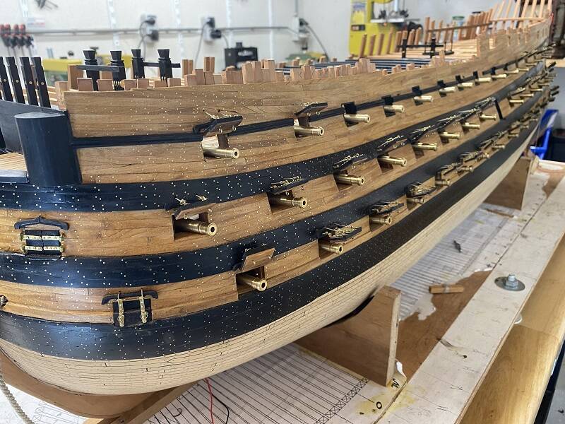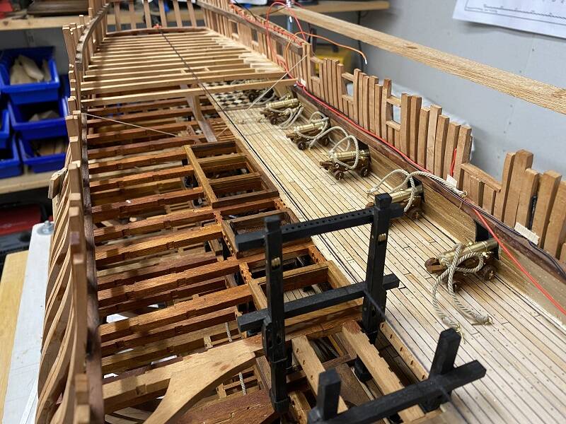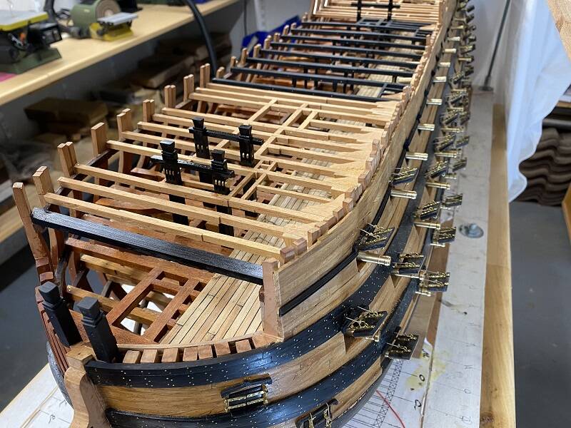 In the coming weeks, the "Gunholes" will be finished and where necessary, hatches will be added. Then the stairs will be placed, etc. In the meantime I will also do the preparations for the 15 "12 pound Guns Long" that will be placed on this deck. So things are progressing nicely, but there is still a lot to do.
