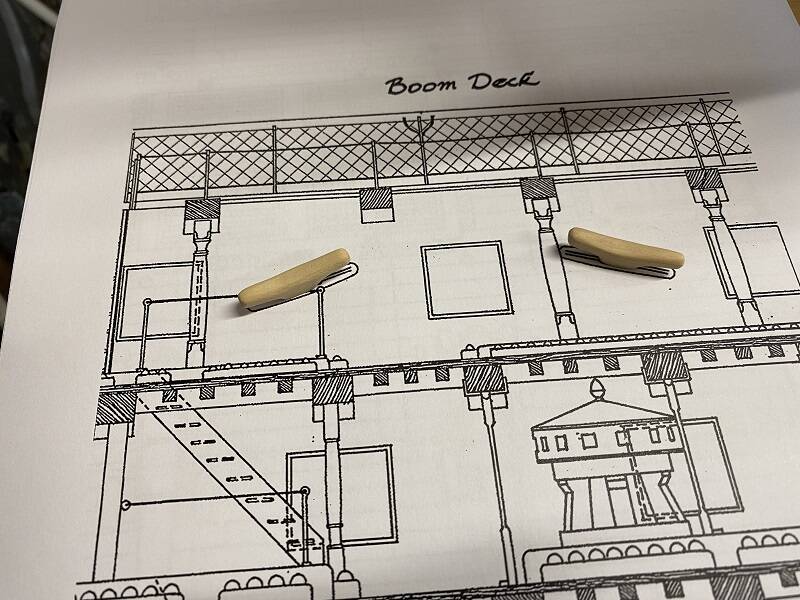 If you look closely, you can see the "Elm Pump" between the Bitts. This runs all the way through all the decks to the hull down in the hold. In the next few weeks, the final deck beams of the "Boom Deck" will be installed and I will be focusing on the chimney of "The Broddie Stove" and the "Bitts" that are at the foremast. In short, we still have some work to do